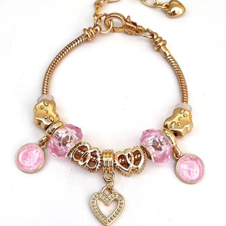 This gold bracelet elegantly combines pink crystal beads with heart and intricate pattern-shaped charms, creating a refined accessory designed for ladies who appreciate subtle sophistication. Its harmonious blend of shimmering crystals and delicate motifs adds a graceful accent to any outfit, perfect for elevating everyday fashion with timeless charm.