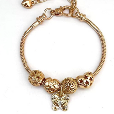 Elevate your elegance with this golden bracelet featuring delicate butterfly charms and an array of refined golden beads. Its sophisticated design brings a touch of timeless charm, making it a perfect accessory to complement both casual and formal ensembles. Crafted to add subtle sparkle and graceful movement, this bracelet captures beauty in every detail.
