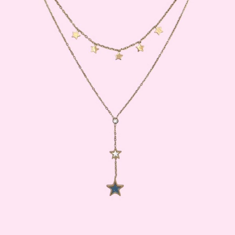 Elevate your style with this layered gold necklace featuring delicate star pendants. Its refined design adds subtle elegance to any outfit, perfect for layering or wearing solo. Crafted to catch the light gracefully, this piece enhances your look with a touch of celestial sophistication.