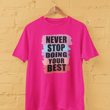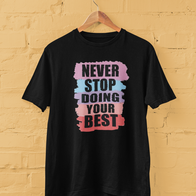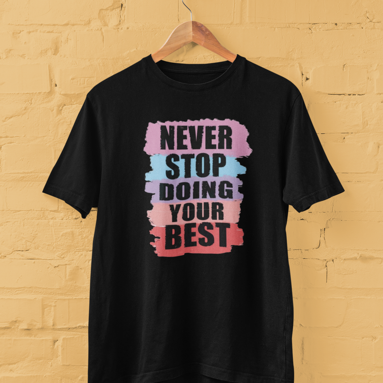"Never Stop Doing Your Best" T-shirt is a stylish and motivational piece designed to inspire perseverance and positivity. Crafted from soft, breathable fabric, this tee offers comfort and durability for everyday wear. Its uplifting message serves as a reminder to always give your best effort, making it a perfect addition to any wardrobe. Whether for casual outings or as a thoughtful gift, this T-shirt combines fashion with a meaningful message.