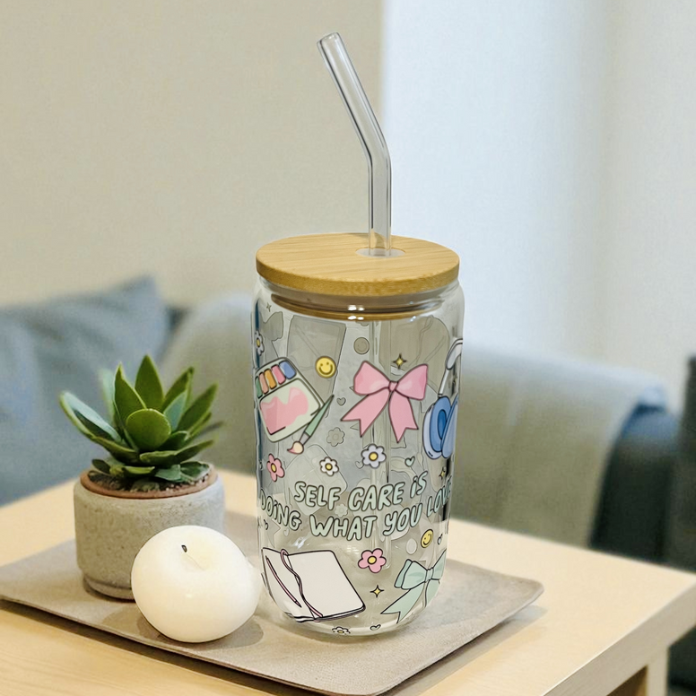 ZenyMar Collections' Self Care Clear Glass Cup with Lid & Straw is your perfect companion for moments of relaxation. Featuring an uplifting "Self Care" design, this durable glass cup is ideal for sipping your favorite drinks. With a secure lid and straw, it’s both practical and stylish for your self-care routine.